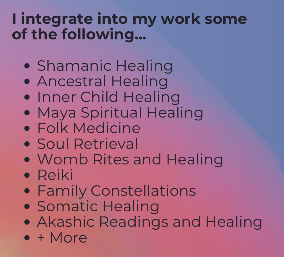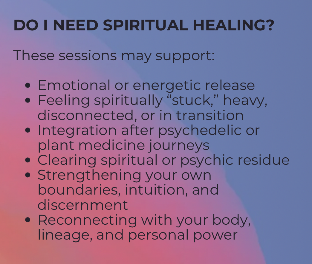 This work is spiritual in nature and offered for personal insight, transformation, and energetic support. It is not a licensed clinical service or medical treatment, and does not constitute psychotherapy or any regulated healthcare modality. I do not diagnose, treat, or cure any condition. By participating, you acknowledge full responsibility for your own healing path.